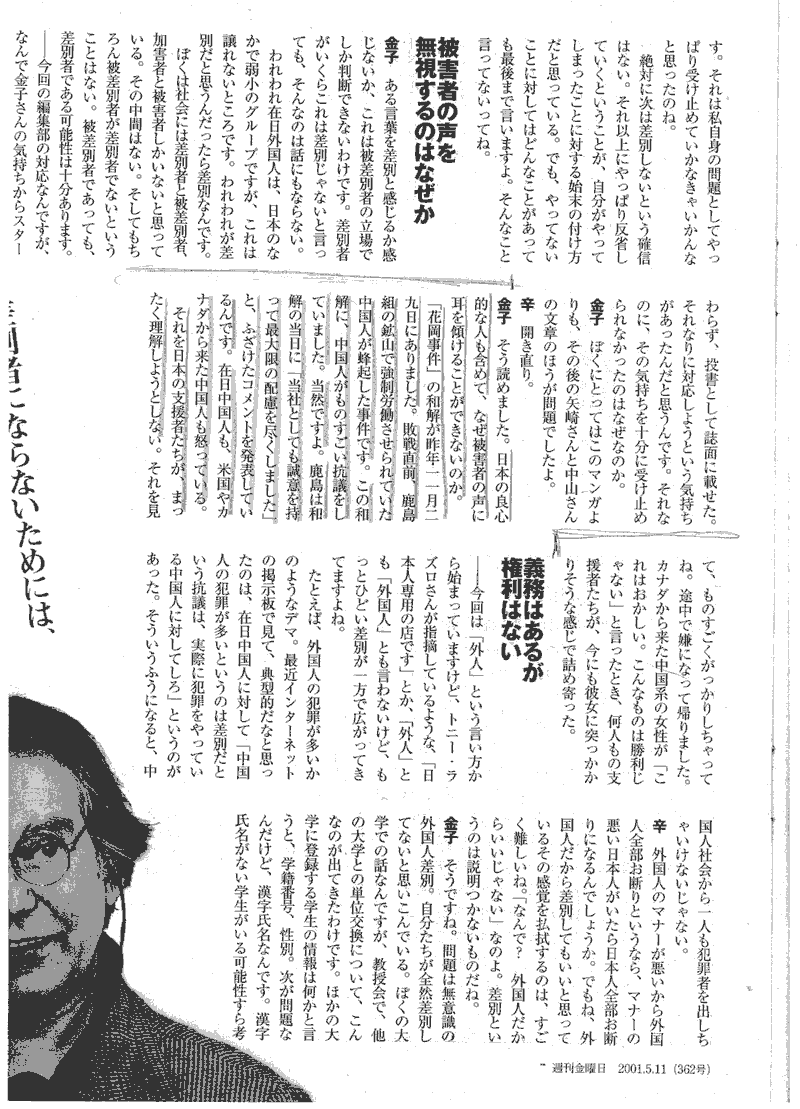 貴紙2010年1月21日、今日の視角「『花岡和解』から10年への反論」寄稿者は弁護士内田雅敏とあります。発言は寄稿者の随意でしょうが、以後何人かの方々がこれに反論したと聞いておりますがその後、反論の類が掲載されたようには見えません。特にテーマからしてこの問題には異論反論が予想されますが、新聞社は何故一般読者の反論を無視して一方の言い分だけ掲載されるのでしょうか? 掲載文は読者が自由に意見の交流出来る所だと考えていましたが、先ず御社の姿勢を問いたいと思います。