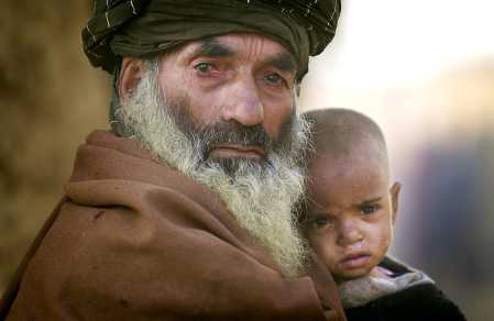 Oct. 7. (AP Photo/David Longstreath) 2001年12月5日水曜日、カブールからのアフガニスタン人難民が、 Rawalpindi 、パキスタン、近くで他の人たちが難民キャンプを去るのを見る間に、彼の孫を抱いています。 ( UNHCR )国連難民高等弁務官は、空襲が10月7日に始まったので、およそ20万人の人々がアフガニスタンから逃げたと言いました。 |