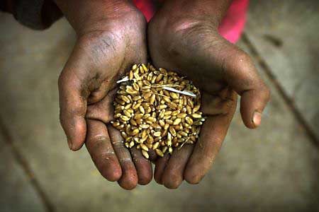 22. (Damir Sagolj/Reuters) 2001年12月5日、アフガニスタンの少年がカブールに人道的援助を配達していたトラックの下で集めた食物穀物を持ちます。 アフガニスタン人閥が打ちのめされた国を12月22日から再建し始めるために、 Hamid Karzai Pashtun チーフによって率いられた タリバン(Taliban) 後の政府を設立するためにランドマーク協定に署名しました。 |