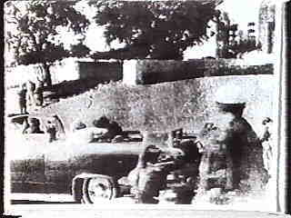 ←メアリー・ムー・モーマンが撮ったポラロイド 写真の原画。まさにJFKが狙撃された瞬間で、 この直後に、JFKの右後部が吹き飛ぶ。 ゲーリーとジャックが注目したのは丘の上の フェンスで、その立ち木の下にライフルを構え る警察官の姿を割り出した。 |