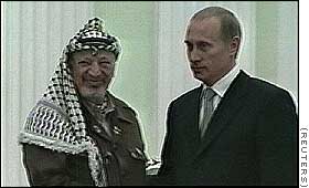 | アラファト議長(左)とプーチン大統領 =24日、モスクワで |