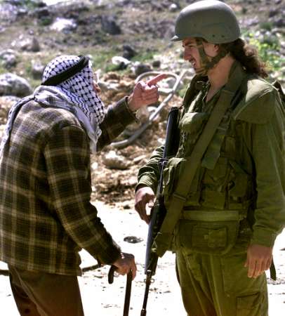 パレスチナの老人がイスラエル兵に抗議する。 |