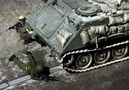 | ラマラ大通りで戦車を盾にパレスチナ人を標的に狙うイスラエル兵 |