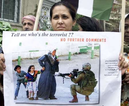 | ダマスカスの国連事務所前で、イスラエルによるアラファト議長監禁に抗議して デモ行進をする約千人規模のパレスチナ人たち。参加者の持つ写真はイスラエル軍 の銃から子どもを守ろうとしている母親、すでにシャロン首相は戦争を明言している ことから、このイスラエル兵の持つ銃には引き金に指がかかっているものと思われる。 つまり、彼は子どもたちをいつでも射殺できる体勢にあるということになる。 |