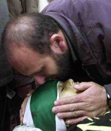 Mahmoud Helles はガザ都市2001年3月3日土曜日に埋葬の前に彼の死んでいる息子、13歳のモハンメッド、の額にキスします。 少年は東のガザ Karni 踏切の近くで頭でイスラエルの陸軍兵隊によって2月27日に撃たれた後で金曜日に死にました。 (AP写真/ Hatem Moussa )