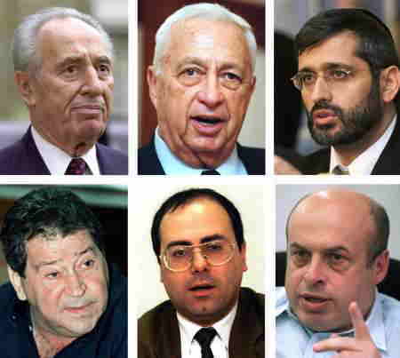 | 時計回りの一番上の中心から: ●アリエル・シャロン首相Ariel Sharon 、リカド派、●エリ・イシャイ内務大臣、Eli Yishai 、Shas 党、●ナタン・シャランスキー住宅建設大臣、Natan Sharansky 、イスラエル Ba 'Aliya 、 ●シルヴァン・シャロム大蔵大臣、Silvan Shalom 、リカド派、 ●ビニャミン・ベンエリーゼル国防大臣、Binyamin Ben-Eliezer 、労働者党、●シモン・ペレス外務大臣、Shimon Peres |