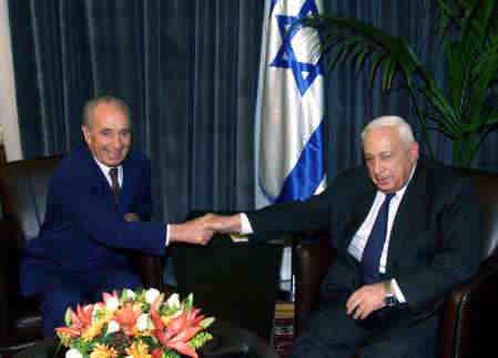 | イスラエルの首相、アリエル・シャロンは、ミーティングの前に新しい外務大臣シモン・ペリスと握手します。 |