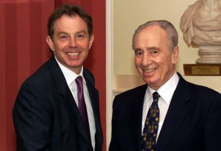 Peres (R) is greeted by British Prime Minister