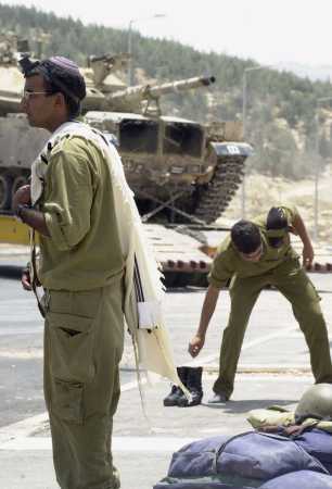 イスラエルの軍隊オフィサーは祈ります、彼のタリスを着用していて、去った、もう一人の兵士が変わるのに忙しいように、彼の、一定、右、道の上で、イスラエルの軍隊がエルサレム木曜日、2001年7月19日からキャリアー、背景、南上のタンクを転送したところで。パレスチナ人がパレスチナのエリアの侵入のためにそれが構築していなかったイスラエルの保証の懐疑を言葉に表していた一方、維持された、新しく位置したイスラエルのタンクおよび軍用車両は木曜日に2つのヨルダン川西岸地区町の上で見ます。(AP写真/Rikard Larma) |
