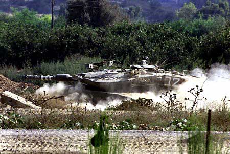 | An Israeli tank guards the Jewish settlement