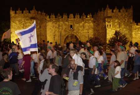 Dejong) それらがTisha Be'Av(それは西暦(AP写真/ピーターDejong)70年のローマ人による第2のユダヤ人の寺院の破壊を記念する)のスタートを示すために2001年7月28日に、エルサレムの古い都市土曜日の壁を回って進んだとともに、約4,000人の右翼ユダヤ人(イスラエルの国旗を運ぶいくらか)がダマスカス・ゲートを渡します。 |