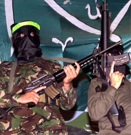 Masked Palestinian Hamas gunmen hold automatic
