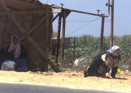 (AP Photo/Hatem Mousa) パレスチナの女性は、Netzarimのユダヤ人の解決のエリア、中央のガザ、2001年7月31日(火)の道を横断する前にイスラエルのタンク位置から観察されることを回避するためにうずくまります。イスラエルのタンクはパレスチナ人がユダヤ人の解決に2つのモルタル・シェ??aシェル発砲した後、そのエリアの交通を阻止するために引っ越して来ました。(AP写真/Hatem Mousa) |
