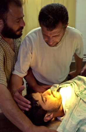 Omar Qusini それが爆発7月の31、2001年までに打たれた後、彼が攻撃的なグループ、ハマスのオフィスを去るとともに、パレスチナ人は反応します。少なくとも8人のパレスチナ人は、ナブルスのヨルダン川西岸地区市の攻撃的なイスラム教のグループ、ハマスのオフィスの爆発で死にました。REUTERS、/、床の中にオマルQusini |