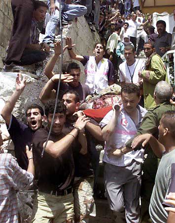 それが爆発7月の31、2001年までに打たれた後、?pレスチナ人は、攻撃的なグループ、ハマスのオフィスから遠ざかって身体を運びます。ナブルスのヨルダン川西岸地区市の攻撃的なイスラム教のグループ、ハマスのオフィスの爆発で少なくとも5人のパレスチナ人が死んだ、と証人および救急車労働者は言いました。(床の中にオマルQusini/ロイター) |