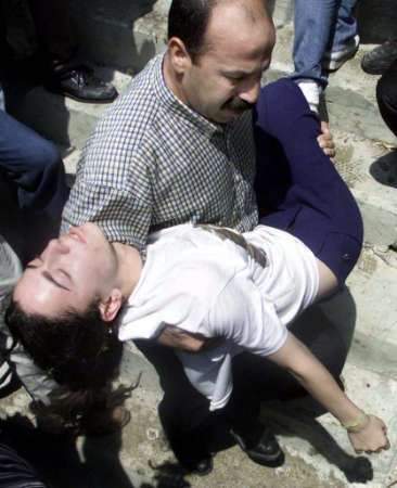それが爆発7月の31、2001年までに打たれ?ス後、傷つけられたパレスチナの女性は、攻撃的なグループ、ハマスの破損されたオフィスから遠ざかって運ばれます。少なくとも8人のパレスチナ人は、ナブルスのヨルダン川西岸地区市の攻撃的なイスラム教のグループ、ハマスのオフィスの爆発で死にました。REUTERS、/、床の中にオマルQusini |