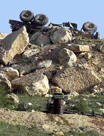 ソフト直訳→破壊されたシリアの陸軍トラックが、イスラエルの軍用飛行機がシリアのレーダー駅を攻撃した2001年4月16日後に、岩の上にひっくり返されて横たわります。