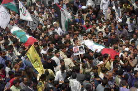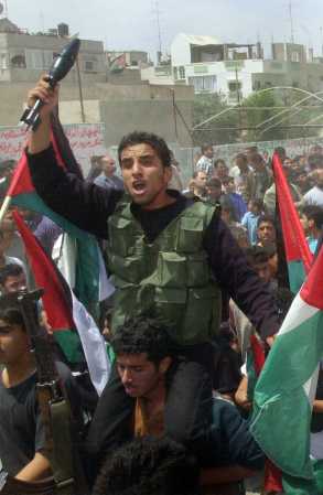 | A Palestinian man holds a mortar shell in his hands as he accompanies the bodies of four Palestinians , who were killed when a bomb went off near the Gaza-Egypt border during their funeral procession in the southern Gaza stip refugee camp of Rafah Thursday April 26, 2001. At the funeral, Palestinians said the blast was an Israeli operation aimed at killing the group members. They said the bomb was planted in a concrete block used to mark the Israeli side of a border road. Palestinians say that since violence erupted Sept. 28, Israel has targeted and killed at least 15 other Palestinian activists. (AP Photo/Elizabeth Dalziel) |