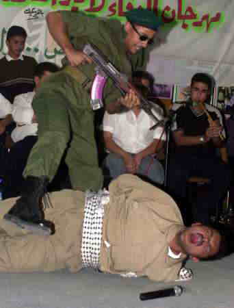 | A Palestinian university student carrying an AK-47 weapon portrays an Israeli soldier arresting Palestinians during an anti-Israeli rally at a university in Gaza City Wednesday April 25, 2001. Israel is marking 53 years since its founding, but the mood is decidedly less than festive after months of Israeli-Palestinian confrontation stalled a full peace agreement between Israelis and Palestinians. (AP Photo/ Hatem Moussa) |